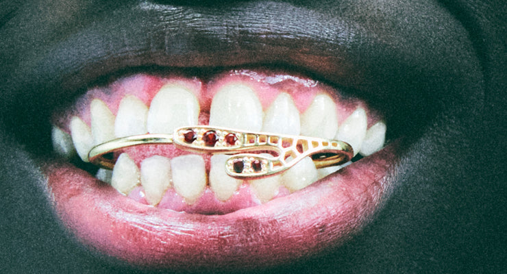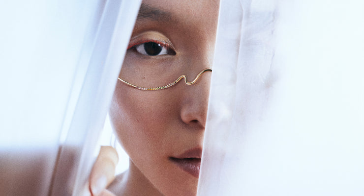 Bijou de visage plaqué or Serti de 18 diamants. Inspiré par l'art de la mosaïque, chaque diamant reflète un fragment de lumière, composant une œuvre d'harmonie et d'éclat.